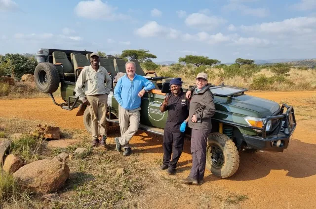 The safari experience at Welgevonden Game Reserve is nothing short of spectacular. Our affable and knowledgeable guide, Biggy, led us on thrilling game drives where we encountered a vast array of wildlife. The reserve is home to healthy populations of elephants, rhinos, buffalo, zebra, wildebeest, elands and many others. Highlights from our visit included a rare sighting of a lone leopard cub hiding in a ravine, a recent lion kill, a feisty drongo bird harassing a much larger African Harrier Hawk, and night-time encounters with rhinos and elephant herds, one nervous bull ushering us nervously on with a full-volume trumpet.
