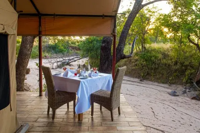 The lodge is located alongside the riverbed and well hidden amongst the acacia and baobab trees. The main areas comprise of a spacious lounge, library and central dining area that overlooks the swimming pool and a waterhole that attracts wildlife. Guests can enjoy a relaxing evening in the lounge with a selection of books and sun-downers by the fireplace. Guests can experience walking safaris and night game drives in the concession.